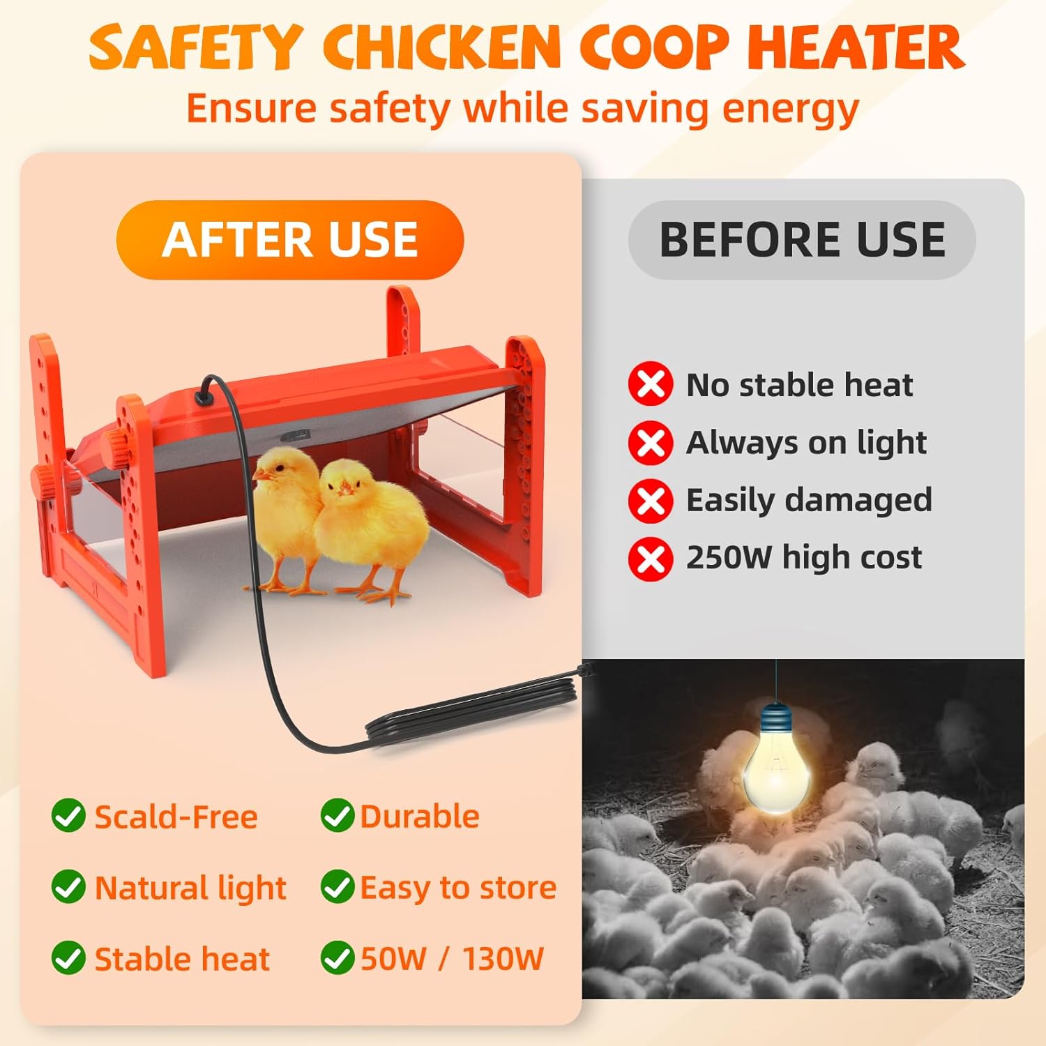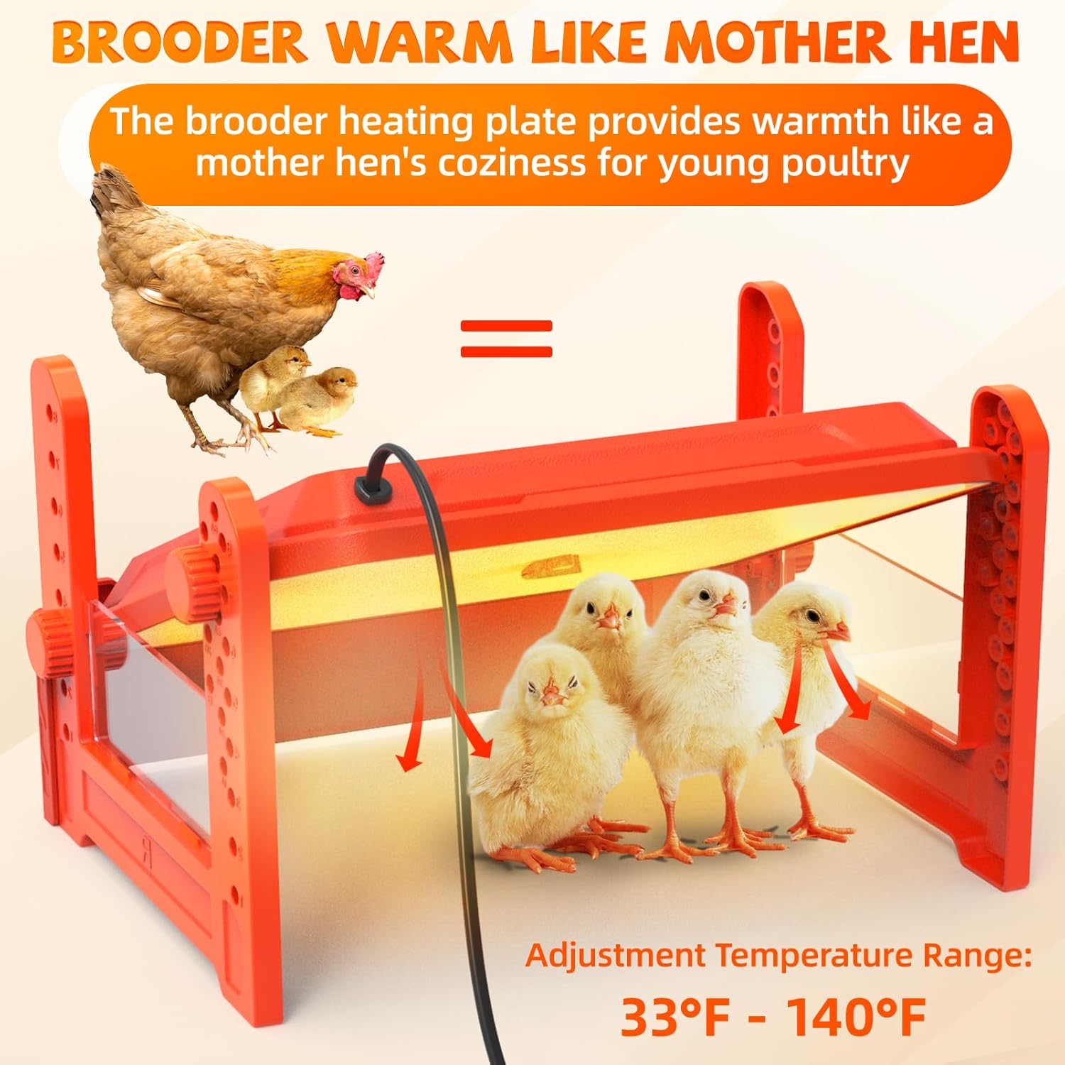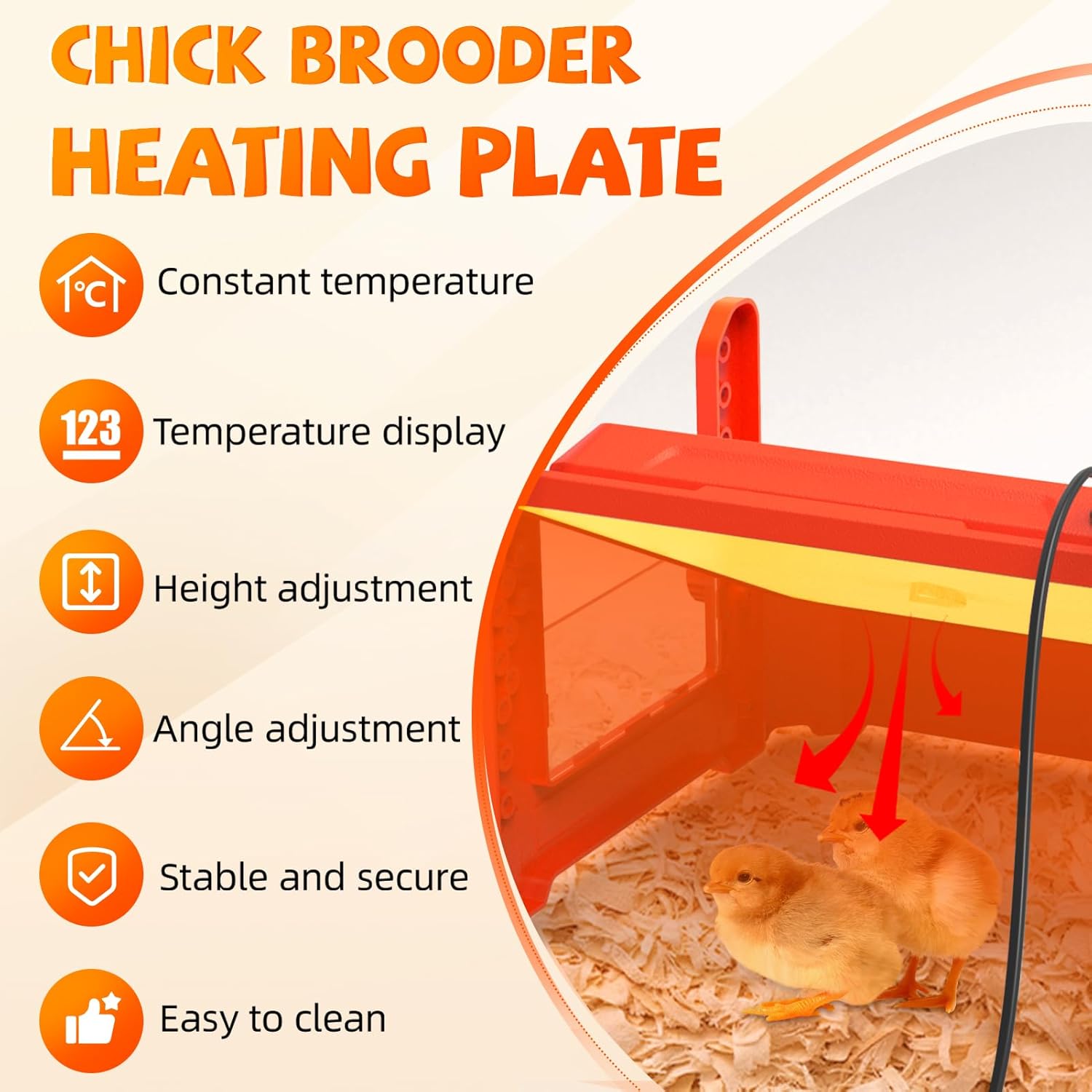 【Chicken Brooder Warm Like Mother Hen】The heating plate power to 50W and warms up to 15 Chicks. The brooder heater can reach a constant temperature quickly, simulating natural heating by the mother hen for healthier chicks.